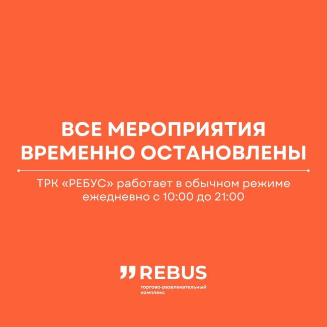 Уважаемые посетители! В связи с терактом в «Крокус Сити Холле» все мероприятия, в том числе воскресные мастер-классы, временно остановлены. О возобновлении проведения мероприятий мы дополнительно сообщим в наших социальных сетях. Следите за новостями! ТРК «Ребус» работает в обычном режиме с 10:00 до 21:00.